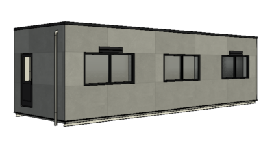7 stk. sammenbyggede pavilloner, indrettet med 2 åbne storkontorer, 1 mindre kontor og 2 mødelokaler, samt 3 toiletter med forrum. Udvendig beklædning er sinusplader.